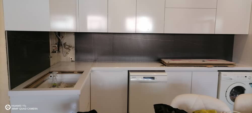 در این پروژه، نصب بین کابینتی با استفاده از چسب مخصوص و ابزارهای دقیق انجام شده است. با رعایت کامل تراز، فاصلهگذاری استاندارد و نظافت حین اجرا، جلوه نهایی بسیار یکدست و زیبا حاصل شده است.